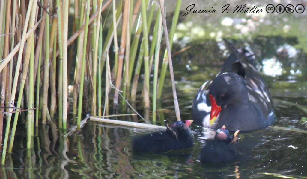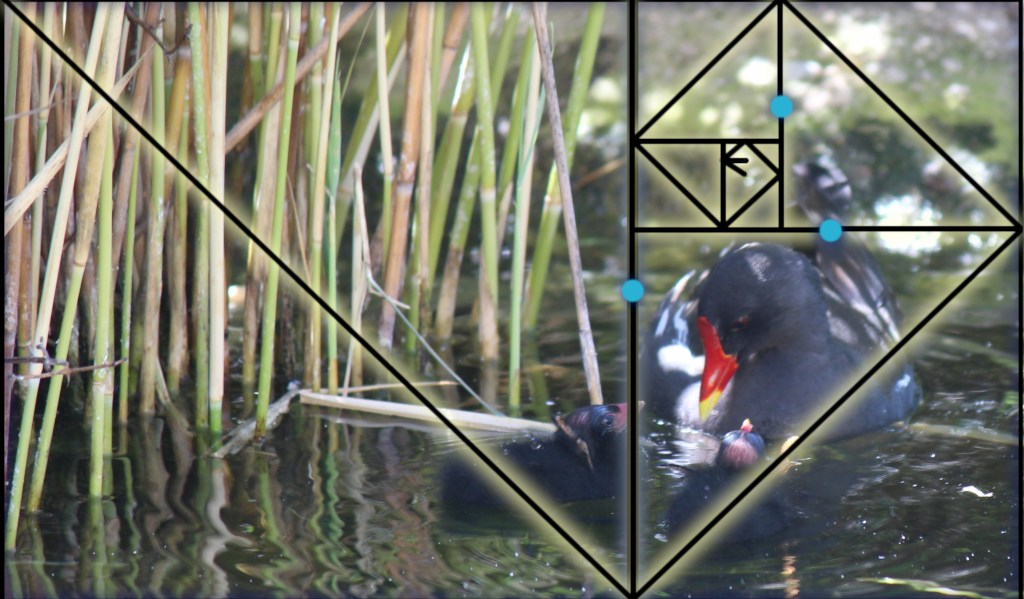 Bei der Aufnahme der liebevollen Entenmutter, habe ich den Bildausschnitt dem goldenen Schnitt angepasst, was für eine natürlich ansprechende Bildkomposition sorgt. Das Schilf nimmt genau die linken zwei Drittel des Bildes ein, während das Muttertier gerade bis zu zwei Drittel des rechten Bildabschnitts hinaufreicht. Die beiden Küken, die im Moment der Aufnahme freudig auf die Mutter zuschwimmen, sind genau auf den Linien des goldenen Schnitts platziert.