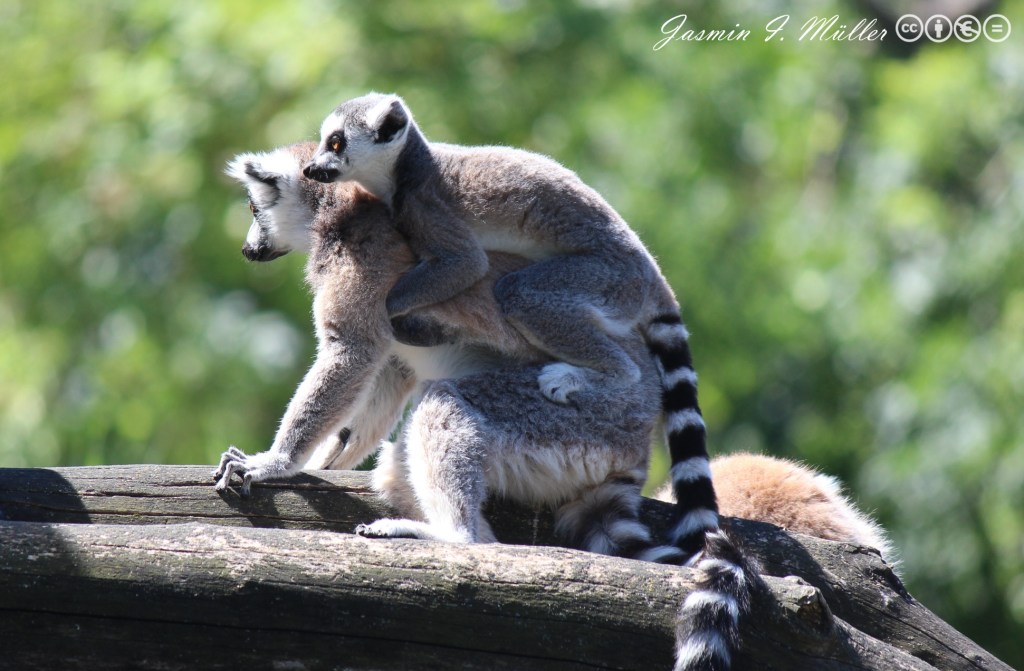 Auch bei den Kattas gab es Nachwuchs. Hier zum Abschluss ein klassisches Tierbild mit zentriertem Motiv. Beide Tiere schauen in die Ferne, als würden sie die Zoobesucher genauso beobachten, wie diese ihrerseits die Tiere betrachten. Die Kattas waren dankbare Modelle, da sie sich in der brütenden Mittagshitze kaum bewegten.